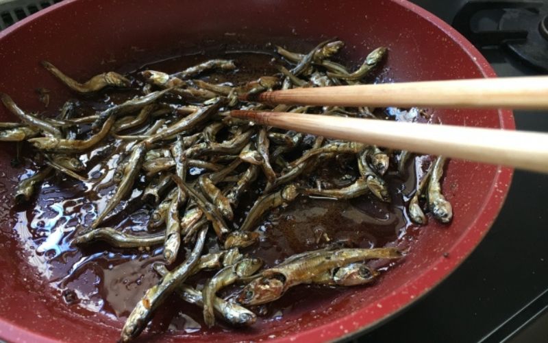 Place the sardines in a dry frying pan (no oil needed) and roast them over low heat. Stir gently until they become crispy and aromatic, but be careful not to burn them. This step removes any excess moisture and enhances the flavor.